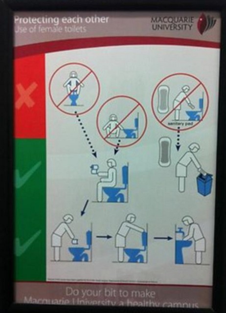 澳洲馬卡利大學(Macquarie University)的女廁內,最近張貼一款「圖解」烸報,教導要上廁所的女生「正確使用馬桶的方法」,讓校內的外籍學生十分不滿,認為這是校方針對外國學生的「歧視」。